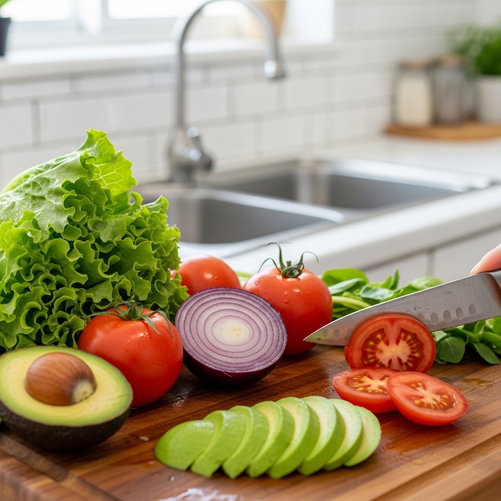 Cut lettuce, tomatoes, onions, and avocado into bite-sized pieces.