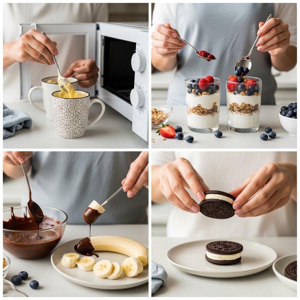 From creamy parfaits to chocolate mug cakes and fruity treats, these desserts come together in just minutes—no stress, no waiting, and almost no cleanup. Perfect for busy nights, surprise guests, or late-night cravings.