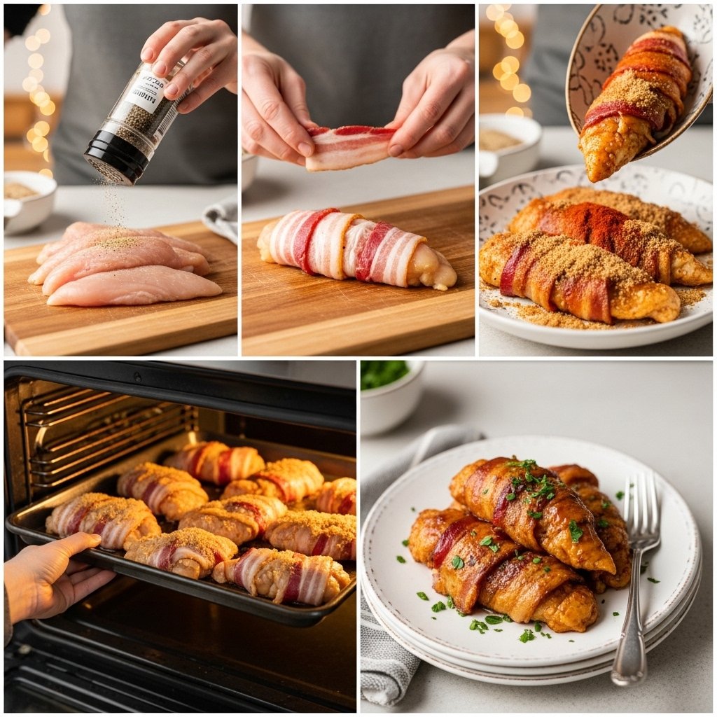 Place on baking sheet and bake for 20–25 minutes until bacon is crispy and chicken is cooked through.