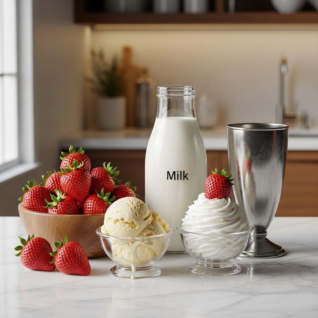 To make this best ever homemade strawberry milkshake recipe, you’ll need: