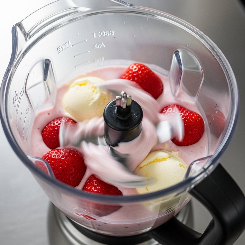 Add strawberries, ice cream, and milk to your blender.