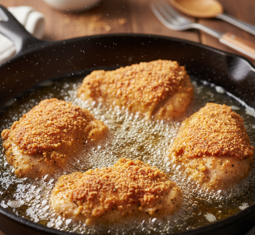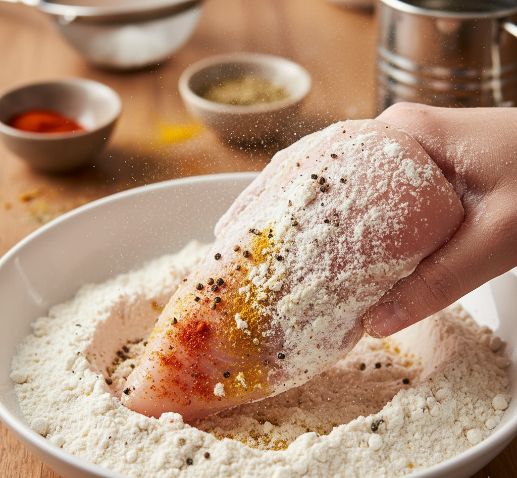 Dredge chicken in flour mixture and fry in hot oil until golden and crispy.
