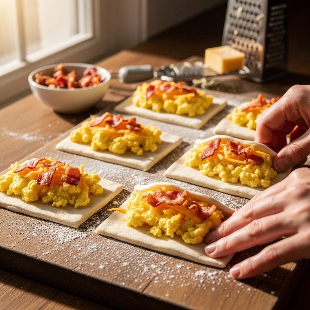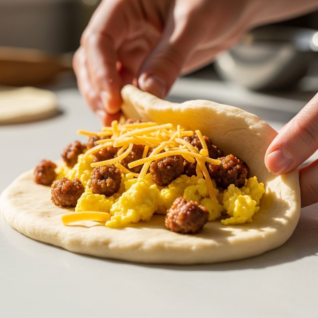Add scrambled eggs, sausage, and cheese onto each piece of dough. Roll tightly into a log or crescent shape.
