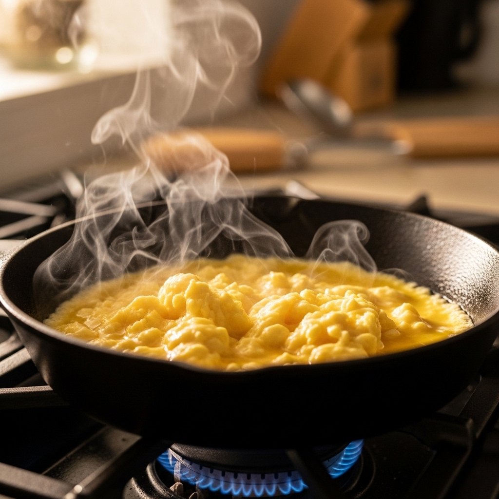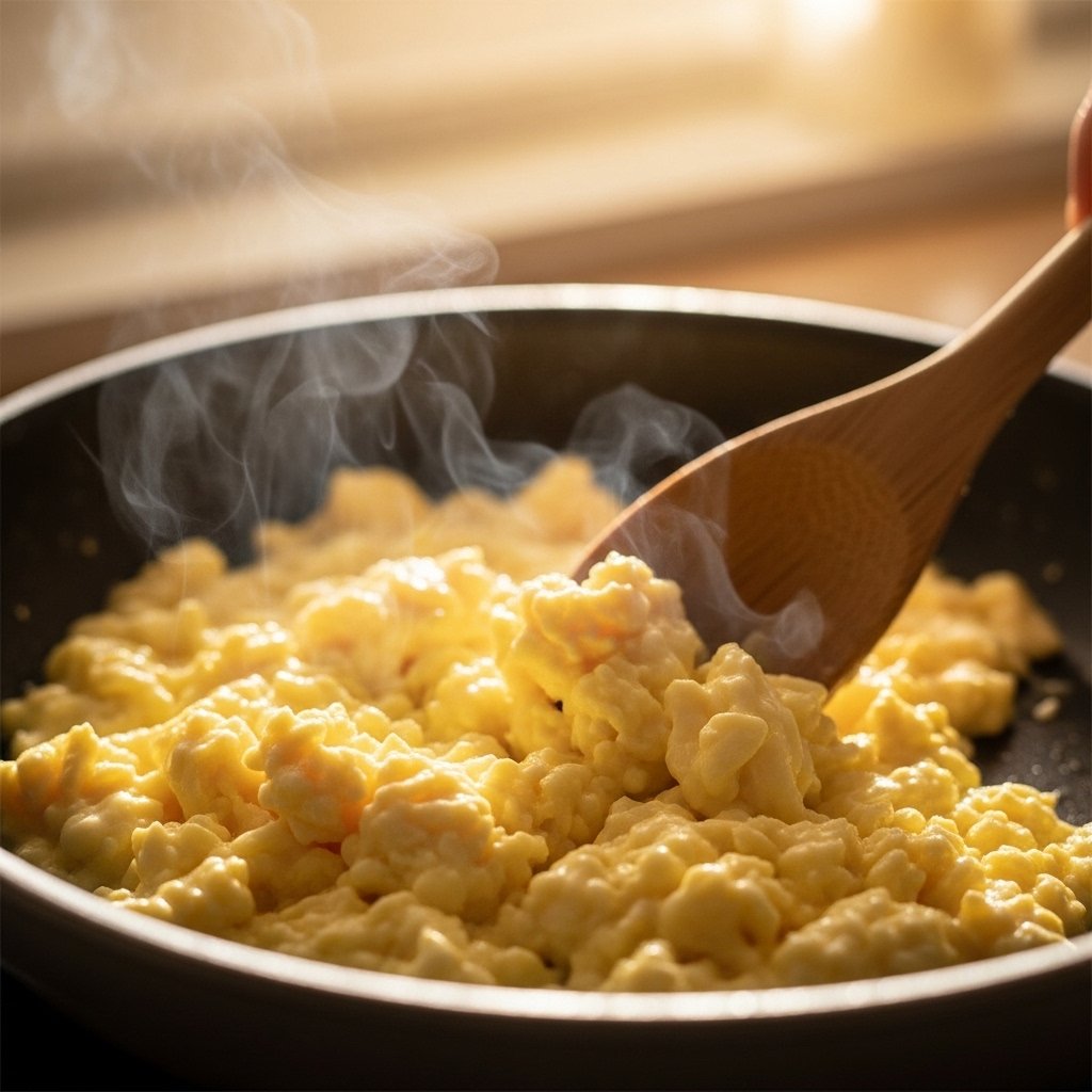 Whisk eggs with milk, salt, and pepper. Cook in butter over medium-low heat until soft and fluffy.
