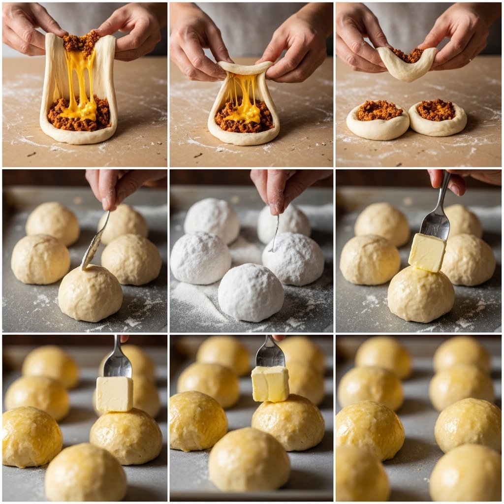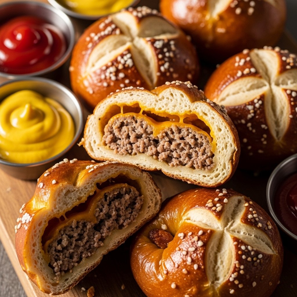 The beef should be cooked and well-seasoned for that classic cheeseburger taste. Cheddar cheese melts beautifully and gives that rich, gooey center. The pretzel dough gets its signature chewy texture from a baking soda bath before baking, which also creates that deep golden crust.