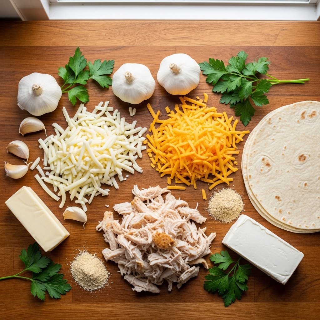 To make these delicious cheesy garlic chicken wraps – ooey, gooey, and ready in minutes, you’ll need: