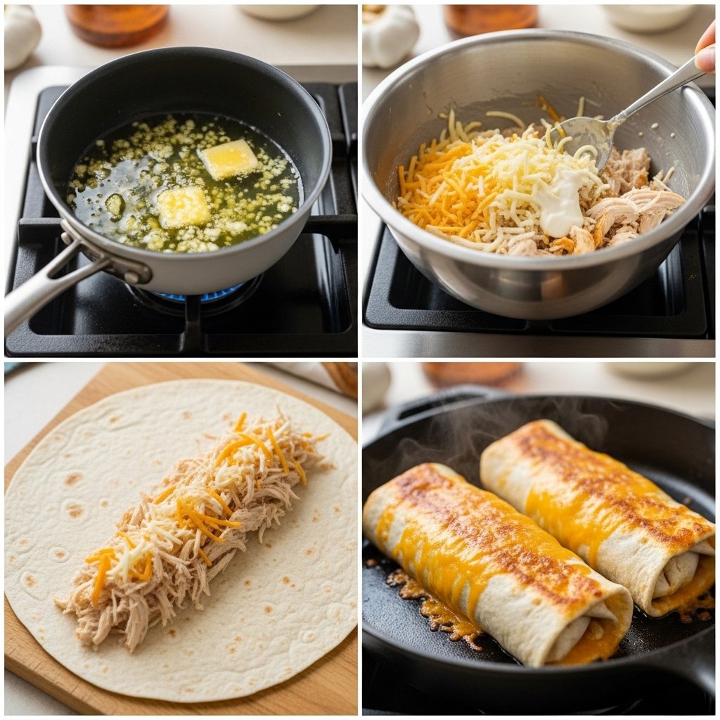 The key to amazing cheesy garlic chicken wraps – ooey, gooey, and ready in minutes is using freshly cooked or rotisserie chicken for convenience and flavor. It soaks up the garlic butter beautifully.