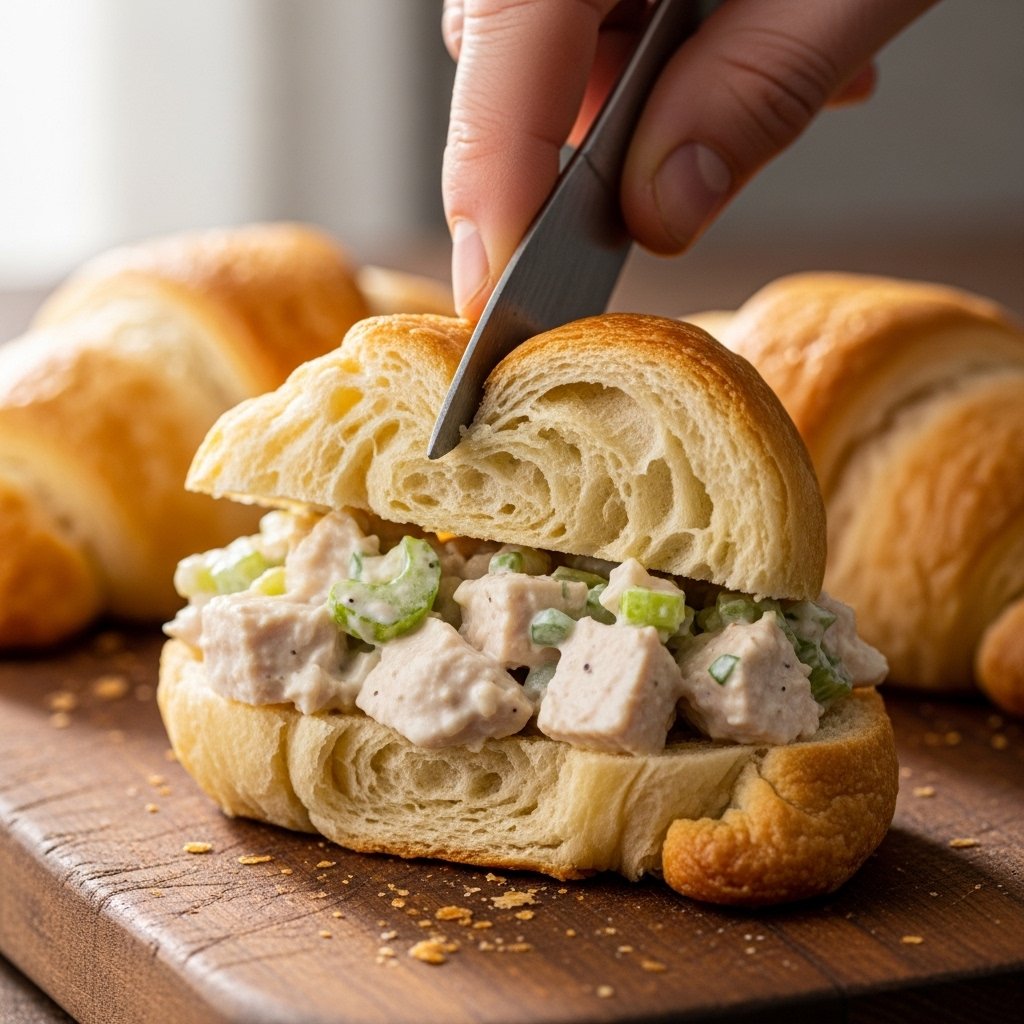 Once cooled, slice crescent rolls in half and generously fill with chicken salad.