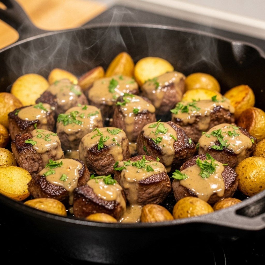 If you’re craving a cozy, restaurant-quality dinner that you can make at home without complicated steps, these Creamy Garlic Butter Steak Bites and Potatoes Make the Ultimate Comfort Meal exactly what you need. This dish is rich, buttery, and packed with bold garlic flavor, tender steak bites, and golden crispy potatoes—all cooked in one pan.