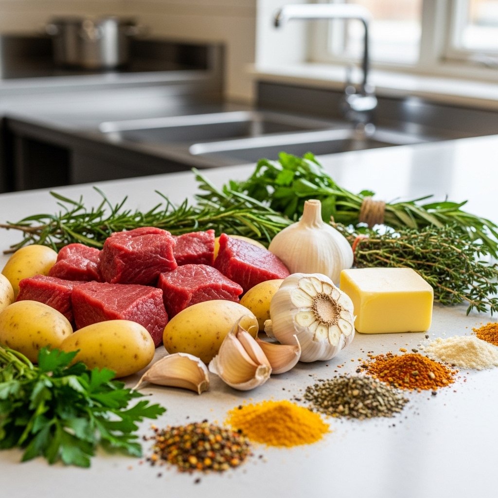 To make this flavorful Creamy Garlic Butter Steak Bites and Potatoes Make the Ultimate Comfort Meal, you’ll need: