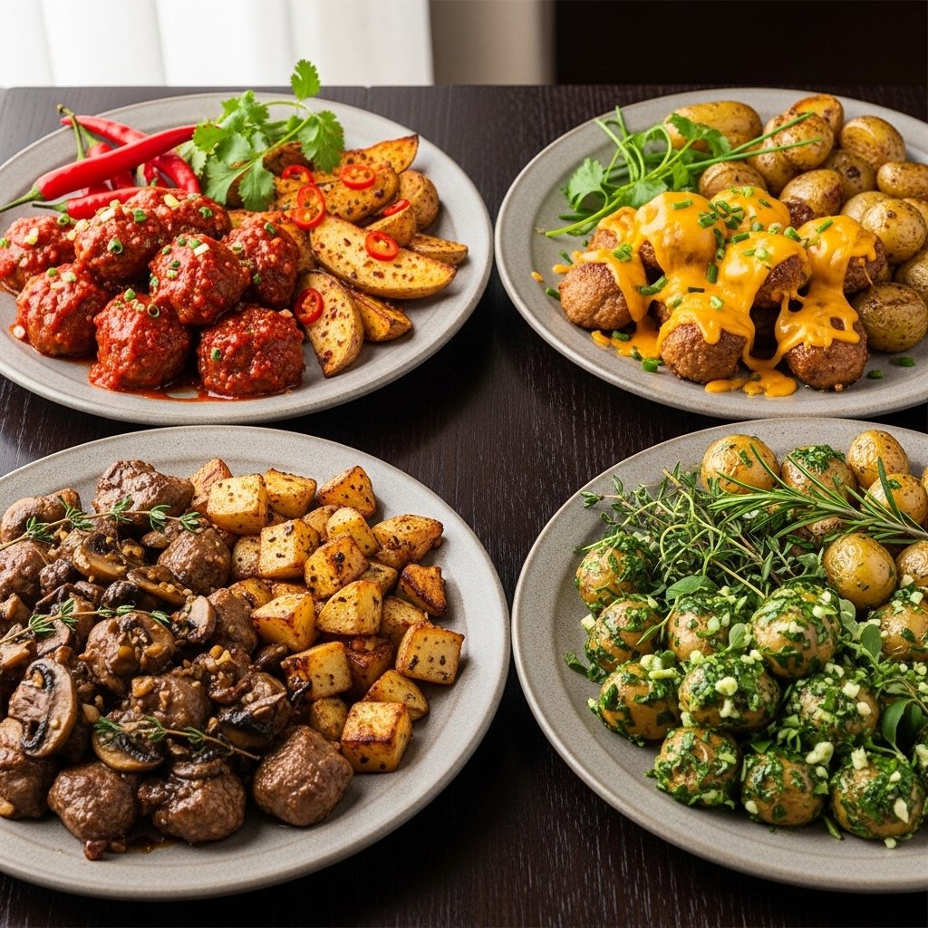 Remove potatoes and set aside. In the same pan, increase heat and add steak bites. Sear for 2–3 minutes per side until browned but still tender.