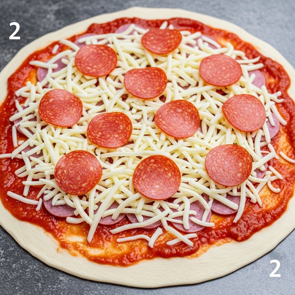 Spread a thin layer of sauce, then add cheese and pepperoni.