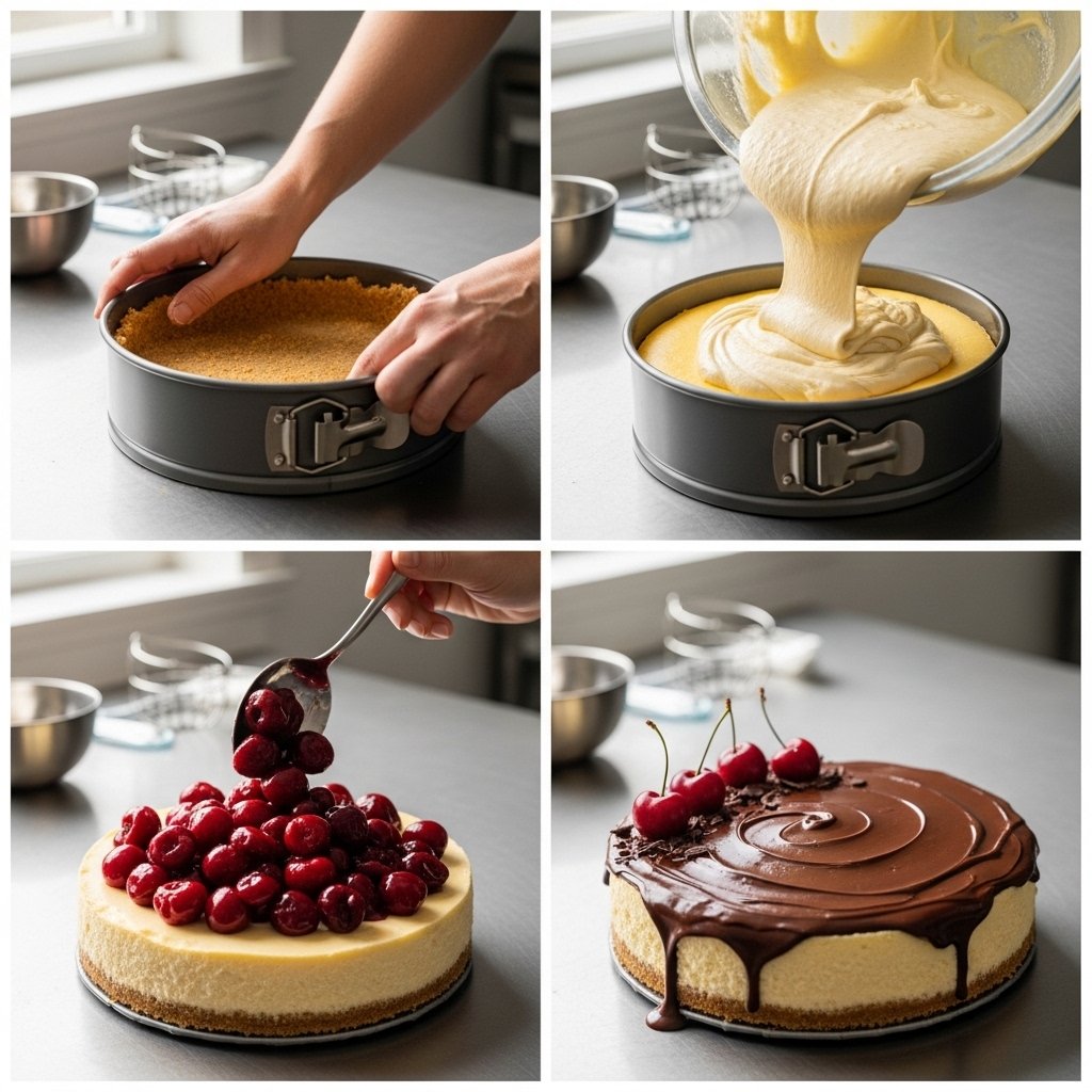 Pour half the cheesecake batter over the crust, add a layer of cherry filling, then top with remaining batter.