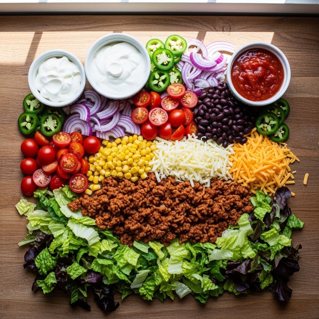 The key to a great layered taco salad in a cake pan is balance. You want a mix of textures—crunchy lettuce, juicy tomatoes, creamy sour cream, and savory seasoned beef.