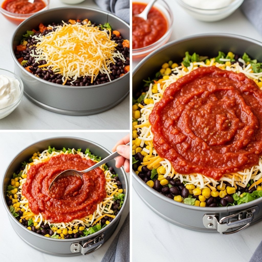 Spread salsa and sour cream (or yogurt) over the top layer.