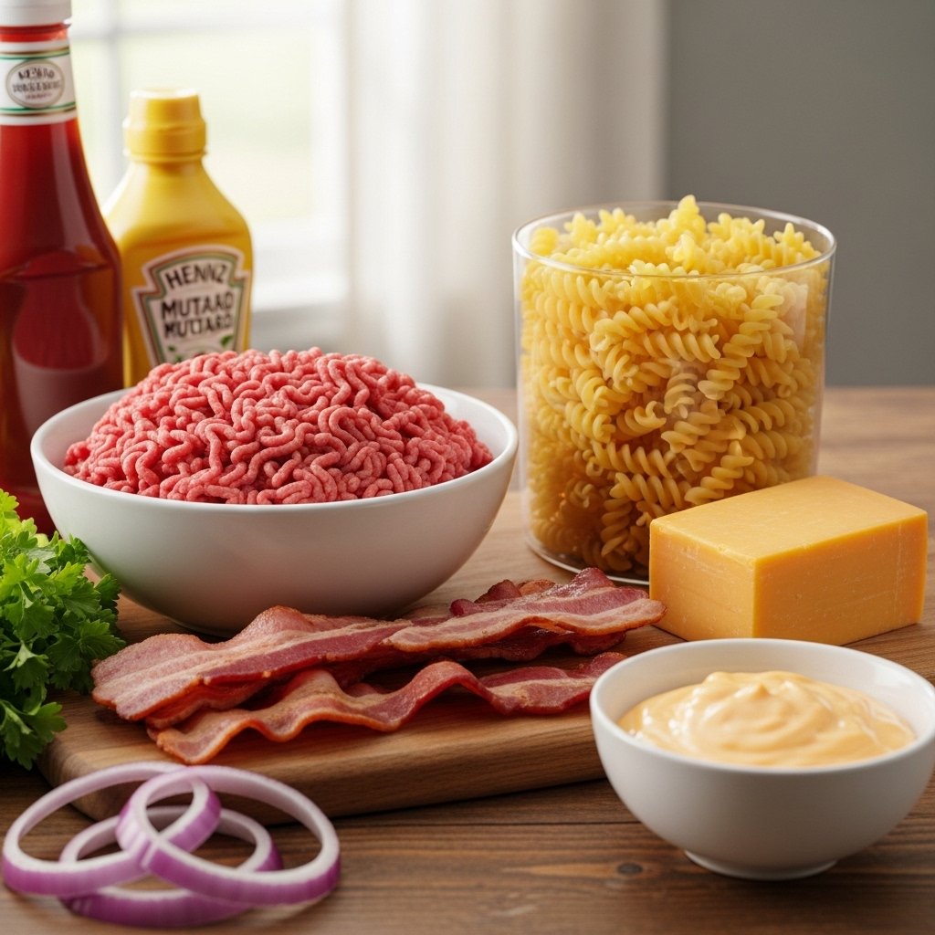 To make this delicious bacon cheeseburger pasta, you’ll need: