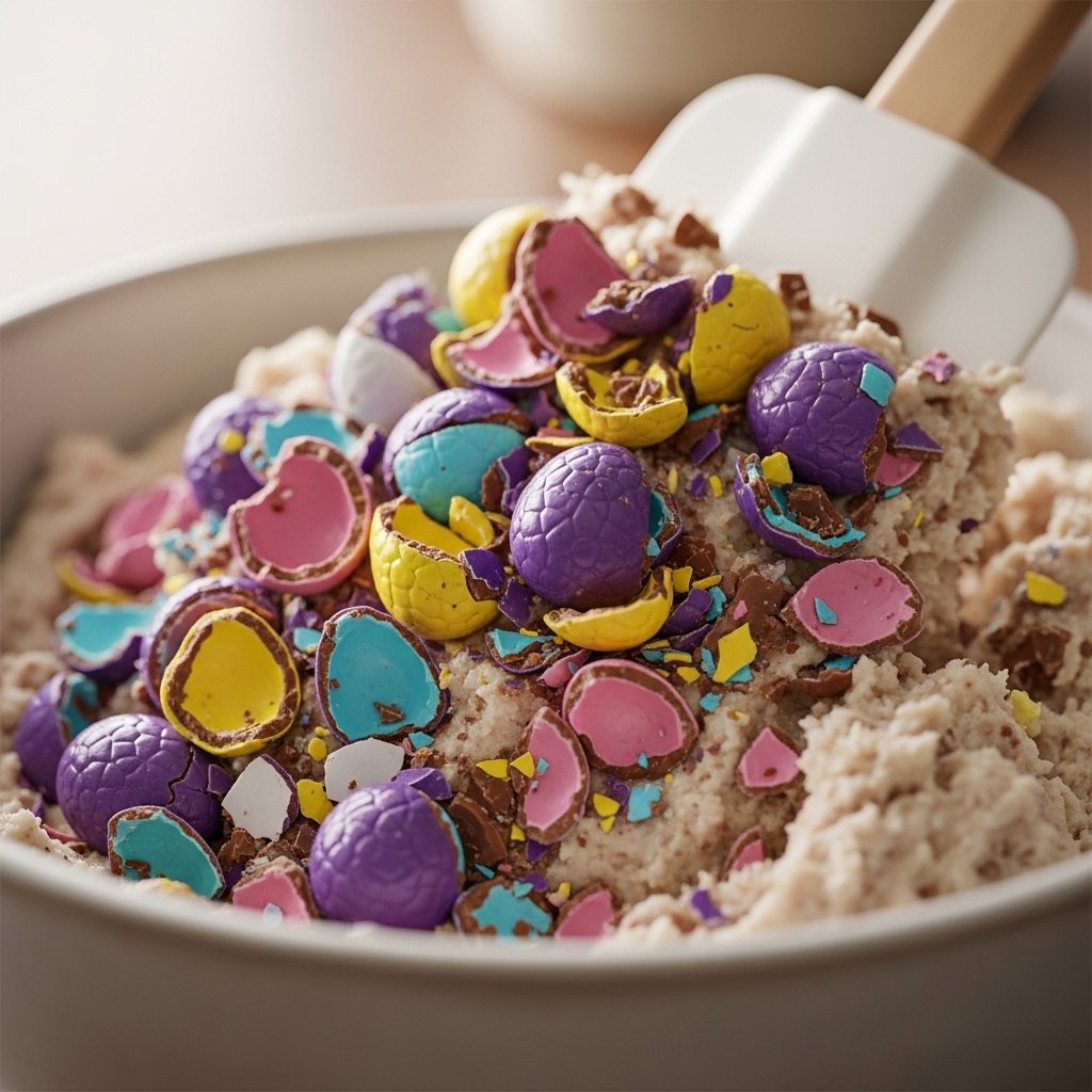 Gently crush mini Cadbury eggs and fold them into the mixture.