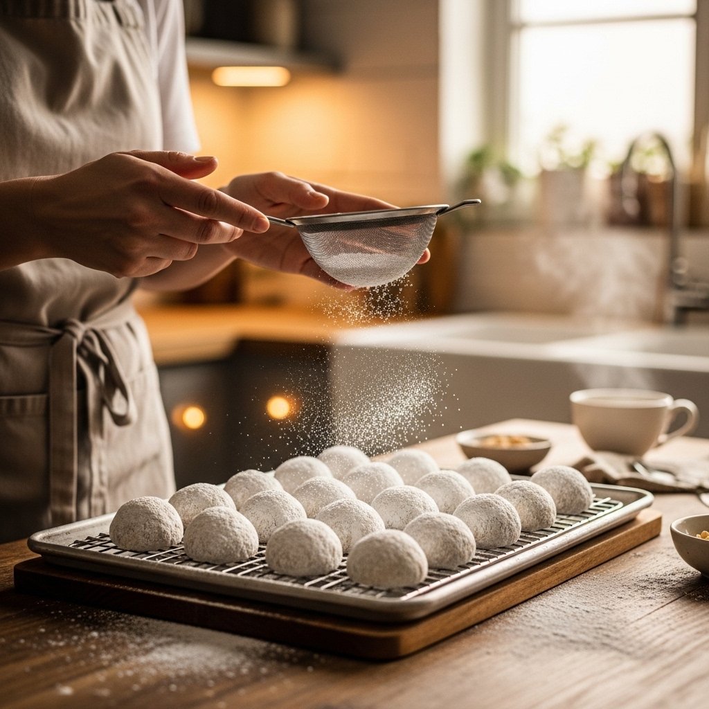 Let cookies cool slightly, then roll generously in powdered sugar for the signature snowball look.