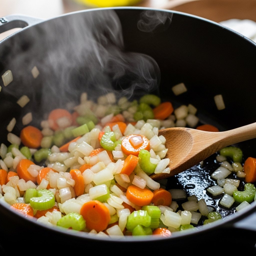 Heat olive oil and cook onion, carrots, and celery until soft.